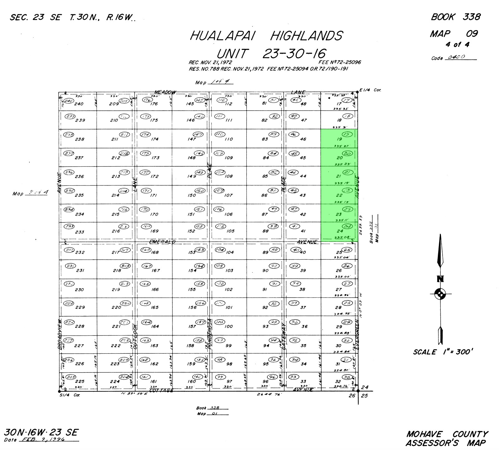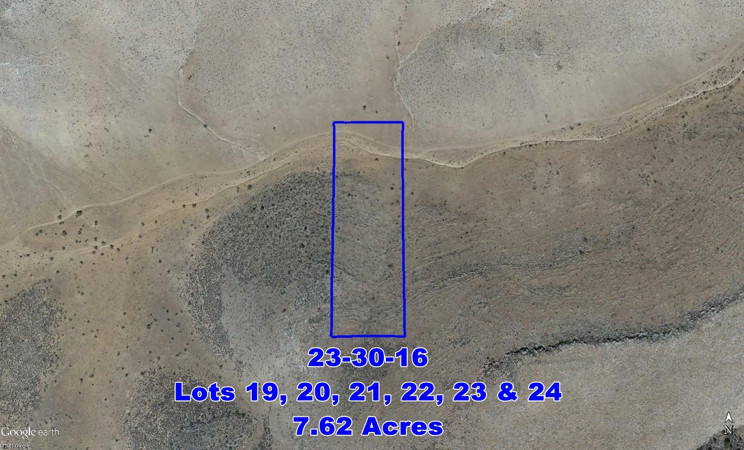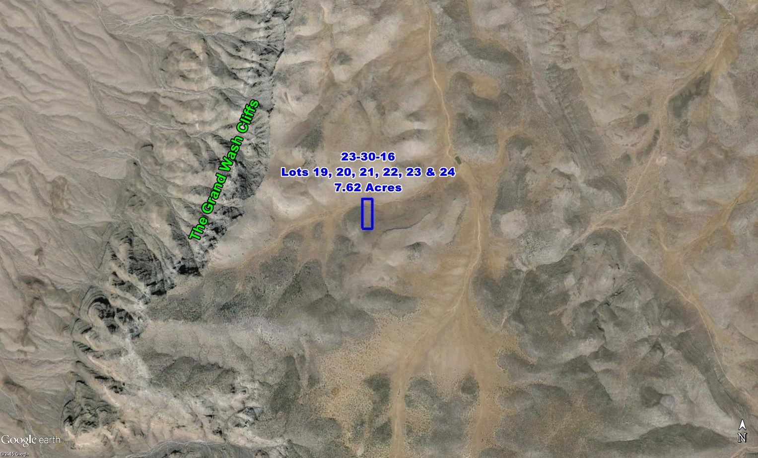 This approximately 7.62 acre group is made up of six adjoining approximately 1.27 acre lots, totaling about 990 feet by a bit over 335 feet. Their legal description is Hualapai Highlands, Unit 23-30-16 Lots 19, 20, 21, 22, 23, and 24.
