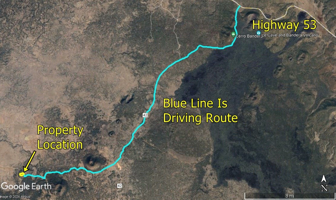 About 1 mile west of the Bandera Ice caves turn south on Route 42. The coordinates of the intersection of Route 53 & Route 42 are 35.006586, -108.090403.