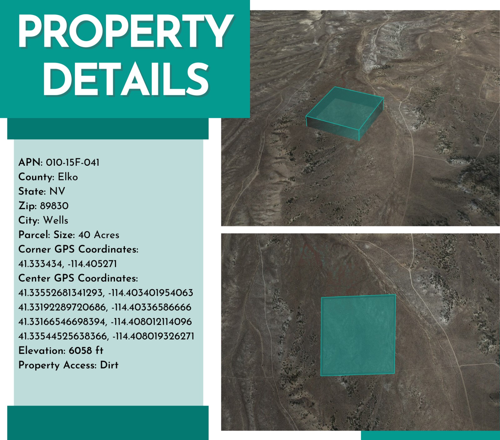 The property is located in Elko County, NV in Sec 21 Twp 40 N Rge 67 E Mdb&M, Wells, NV 89835, spanning 40 acres. It is zoned as Open Space and features level, cleared terrain with no existing structures. Accessibility is landlocked with uncertain legal access, situated at an elevation of 6,034.7 feet. The property is potentially buildable, although more investigation is needed due to access issues. If legal access is established, setback requirements include 50 feet for the front yard, 30 feet for the rear yard, and 20 feet for the sides, with a minimum lot size requirement of 40 acres. Camping and RV usage are permitted, subject to septic system restrictions, and the construction of tiny houses or small cabins is allowed without specific height restrictions. Utilities are largely absent, necessitating the installation of a well for water and a septic system for sewage, with electricity and gas providers likely distant. Waste disposal lacks household pickup, requiring transport to a landfill. No information is available on any Homeowners Association (Hoa) involvement, and the property is not located within a flood zone.