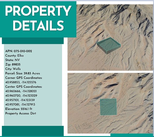 The property is located at SEC 35 TWP 36N RGE 69E Mdb&M in Elko, NV, covering 39.83 acres within the Mountain Meadow Ranches subdivision, at an elevation of 5,516.1 feet. It is zoned as Open Space and features level, cleared terrain intended for potential development. The land is buildable for a single-family dwelling and accessory buildings, with camping, RVs, and mobile homes allowed under certain conditions. However, access is landlocked and may lack legal entry. The parcel currently lacks any structures and is not equipped with essential utilities, requiring installation of a water well and septic system for water and waste management. There are no established connections for electricity or gas, necessitating consultation with local resources. Setback requirements for the property are 50 feet for the front, 20 feet for the sides, and 30 feet for the rear, with no restrictions on construction height. Additionally, there is no known involvement with a Homeowners Association (Hoa) or flood risk associated with the property.