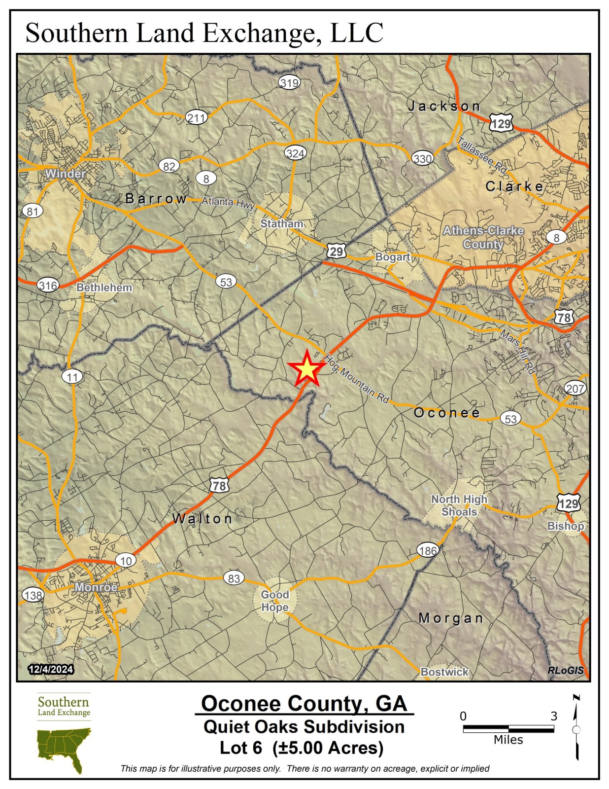 Looking for 5 beautiful acres of land with privacy in North Oconee County? Look no further, as Quiet Oaks Subdivision offers a new residential community of 14 five acre estate lots where you can build your dream home and enjoy gorgeous sunrises and sunsets. Most lots have towering white oaks and perennial flowing creeks, while several lots also have open fescue fields for your horse and two lots share a fish pond. Quiet Oaks is conveniently located about 2 miles from the intersection of Highway 53 and US 78, where Stripling's General Store is located. Oakley Trail has street lights, underground power to each of the lots, and the paved road is maintained by the county. Your investment will be protected with covenants that, in part, require 1 story homes to have 2,500 sq. ft. and 2 story homes to have 3,000 sq. ft. This property has easy access to Highway 316 which is about 5 miles away and it is less than 5 minutes to the new Dove Creek Elementary and Middle School. Contact Thomas Verner for more information.