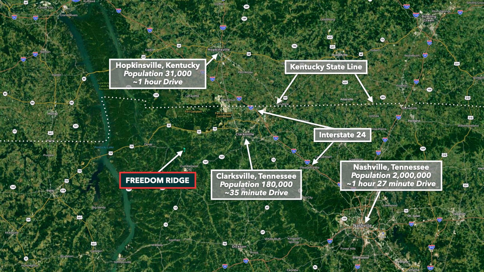 FREEDOM Ridge is also 40 minutes from Kentucky Lake, which winds along the Tennessee River. Kentucky Lake is known for trophy-winning largemouth bass, bluegill, redear, crappie, and catfish.