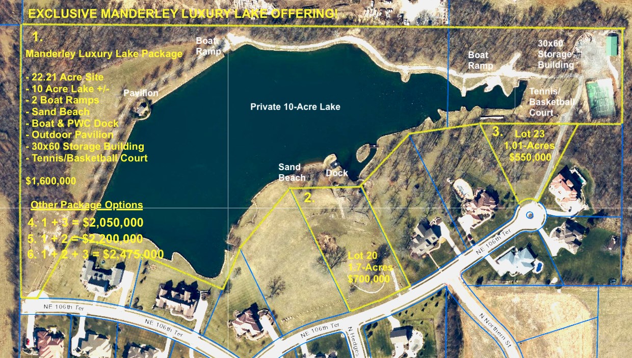 From I-35: Take Exit 17 for Highway 291. Go North on 291. Take the first right on N. Church Road/County Road A. Travel approximately 1.5 miles to the stoplight at 104th Street. Turn left (West) and proceed less than 1 mile on 104th Street to Willow Ave. (the entrance to Manderley will be on your right). Turn right (North) and proceed to 106th Ter. Turn left (West) and proceed to the dead-end. The entrance to the lake parcel will be on your right. Watch for signs. - OR - From I-435: Take Exit 45 for NE Cookingham Drive/State Highway 291. Go South on 291 for approximately 2.8 miles to NE 104th Street. Turn left (East) on 104th Street. Travel East approximately 1.1 miles to Willow Ave. (the entrance to Manderley will be on your left). Turn left (North) and proceed to 106th Ter. Turn left (West) and proceed to the dead-end. The entrance to the lake parcel will be on your right. Watch for signs.