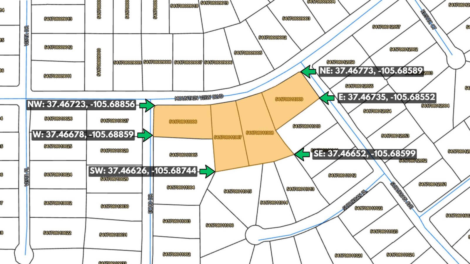 To visit this 5.26 Acres Quadruple Corner lot for sale in Alamosa CO, search Mountain View Blvd corner Echo Rd, Alamosa, Colorado, 81101 within Alamosa County on your phone. When you are near the land, search “37.46723, -105.68856” on Google Map to locate one of the corners. Contact our office for surveys (if available), county plat maps, Google Map boundaries and corners, and MapRight.
