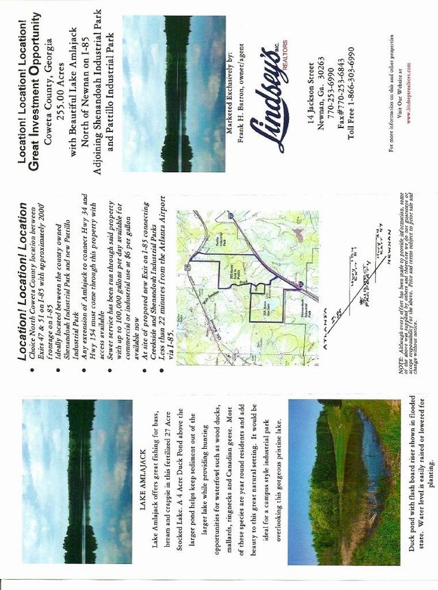 255 acres strategically located along I-85 north of Newnan between Shenandoah Industrial Park and Pattillo Industrial Park. The investment opportunity of a lifetime! Beautiful Lake Amlajack! This beautiful land, including the 27 acre lake that it is named for has approx. 2000 ft. frontage on I-85, between Exits 47 and 51, and over 2000 ft. on country maintained road. It has 3 streams, 127 acres of 25 year old planted pines, and 30 acres of open land, including deer food plots and an 8 acre dove field. Gorgeous Lake Amlajack is loaded with bass, bream, crappie and catfish, and offers some of the best fishing in the area. A 4-acre duck pond above the larger pond helps keep sediment out of the larger lake while providing hunting opportunities for waterfowl, such as mallards, wood ducks, ringnecks and Canadian geese. Most of these species are year round residents and add beauty to this great natural setting. The balance of land is heavily wooded in natural regeneration and hardwoods and all of the land has been under intensive wildlife and timber management for 25 years. The topography of the land is mostly gently rolling, which adds character to this unique property. The soils are mostly red clay, which are ideal for compaction. Georgia Power lines and Transcontinental Gas lines traverse the property so utilities should be readily available in large quantities.