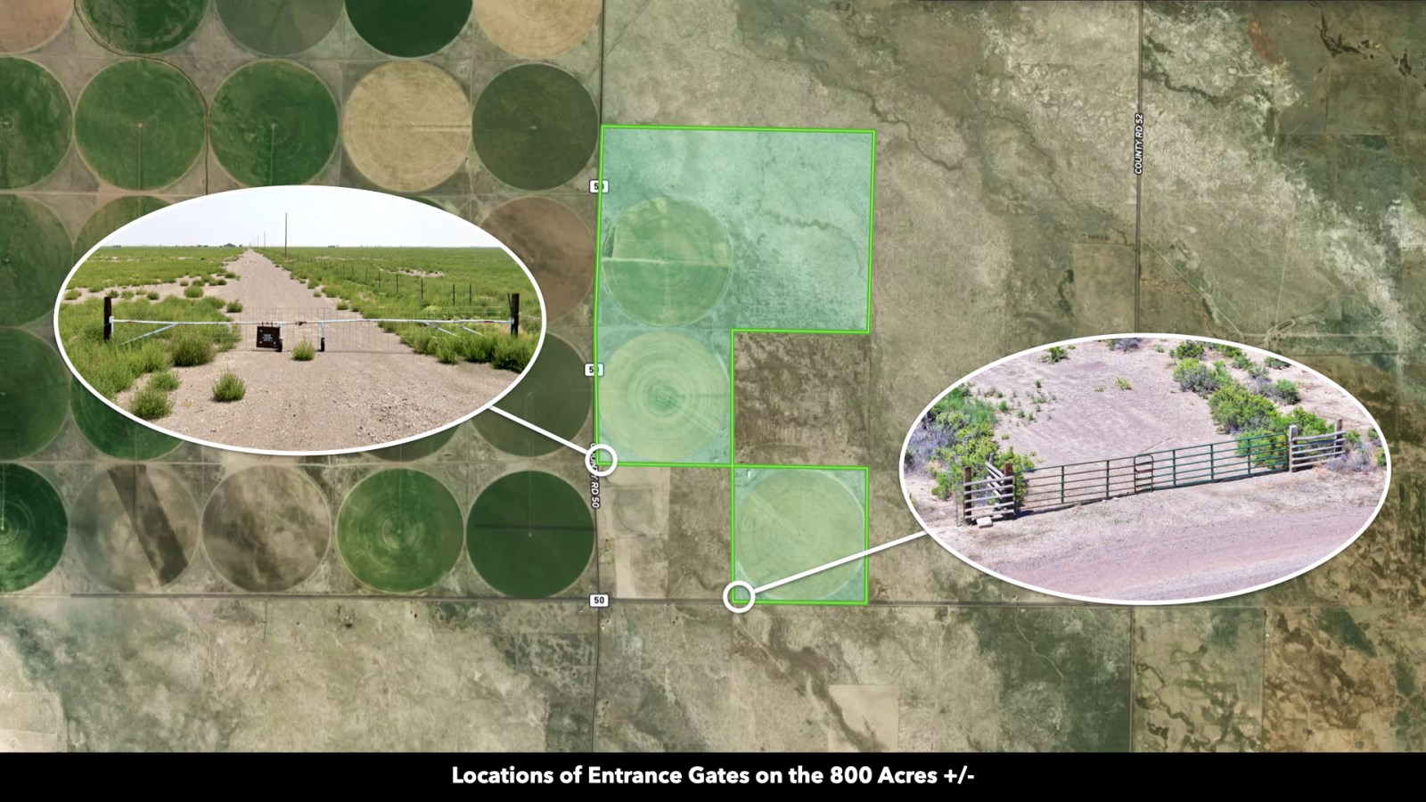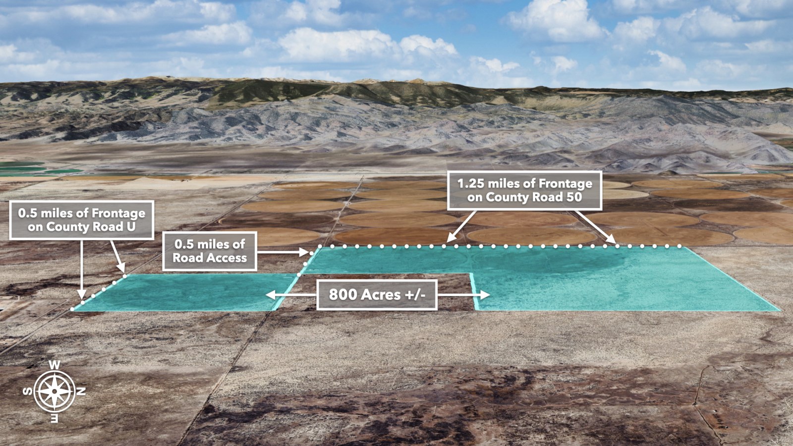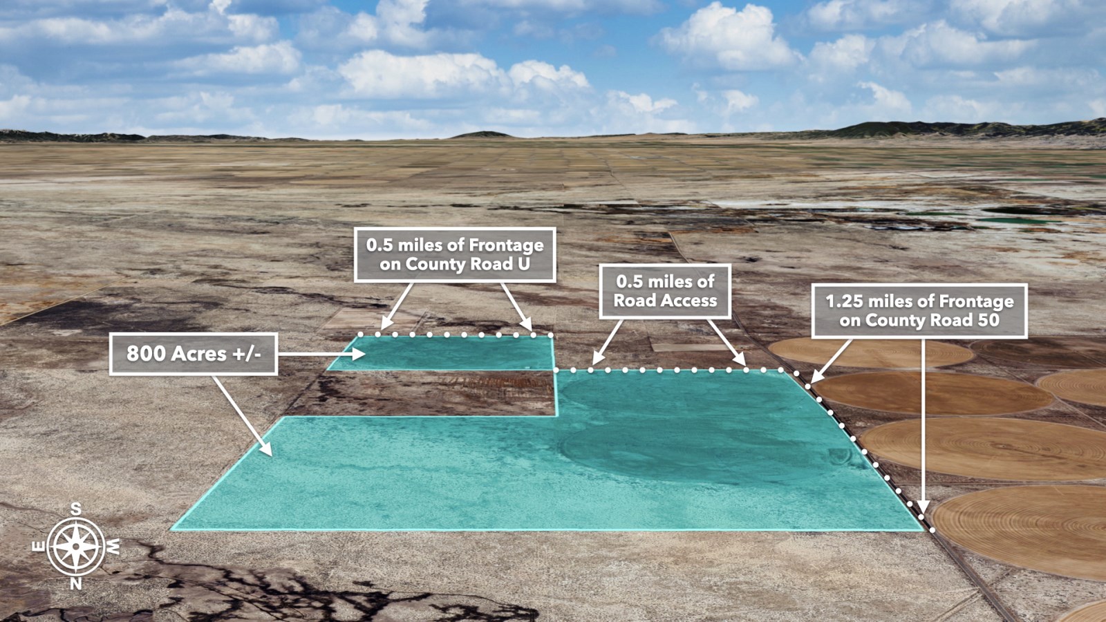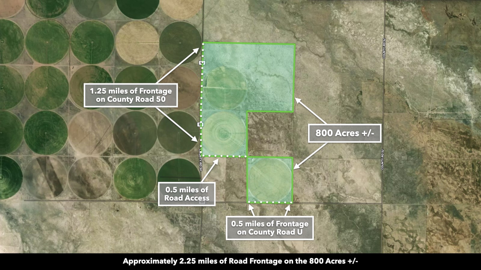 The property offers 1.25 miles of frontage on County Road 50, 0.5 miles on County Road U, and 0.5 miles of road access off of County Road 50 which leads to the barn and loafing shed.