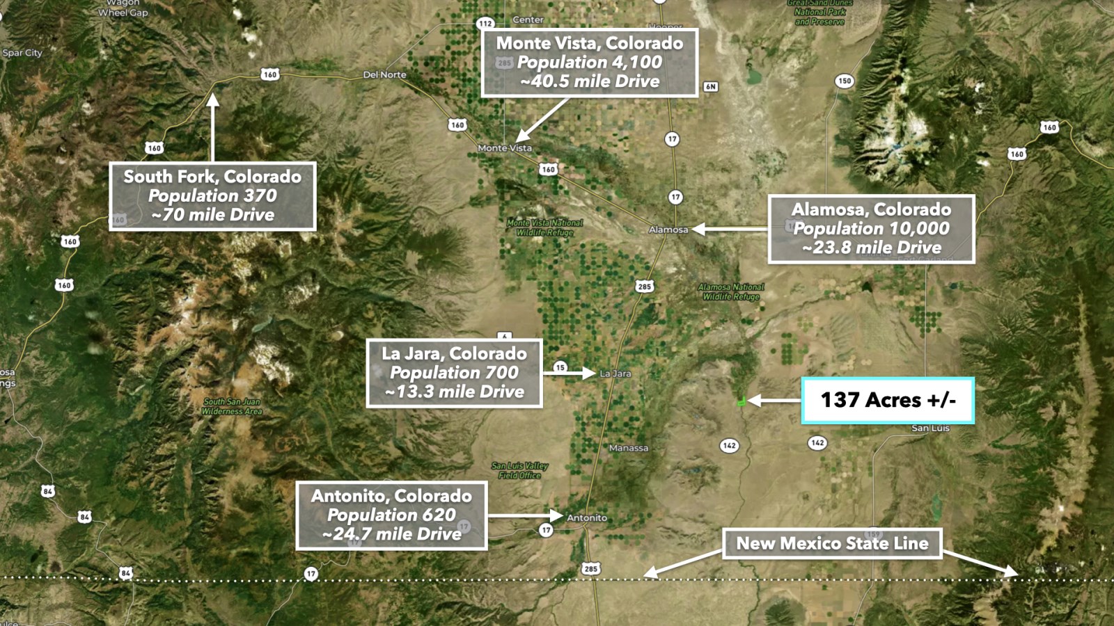The Property is 23 miles from Alamosa, which has a Population of around 10,000. In Alamosa you will find a Hospital, Multiple Grocery Stores, Fuel, Building Supplies, Walmart, Restaurants & Professional Services.