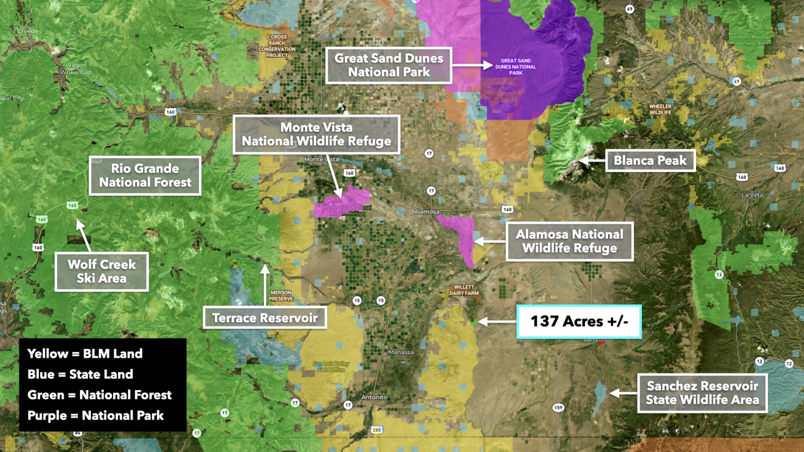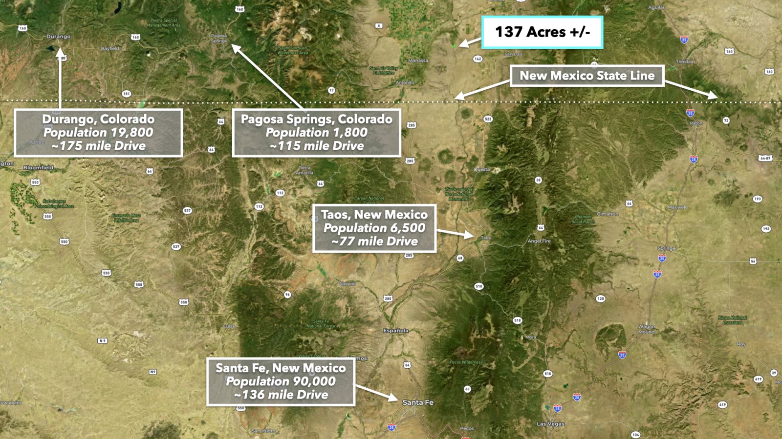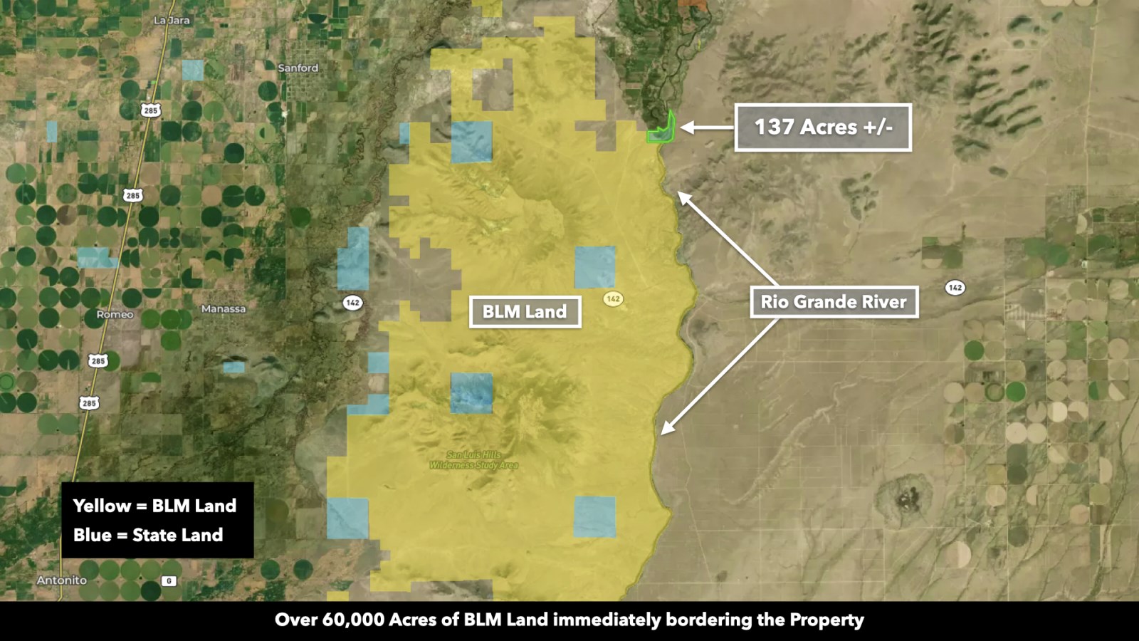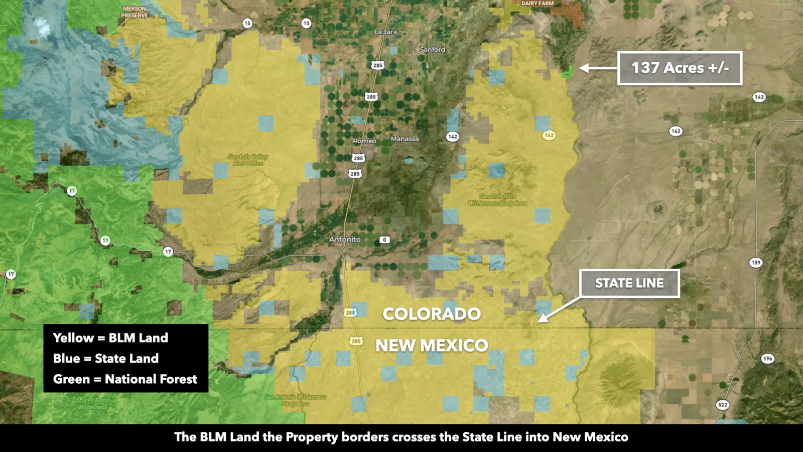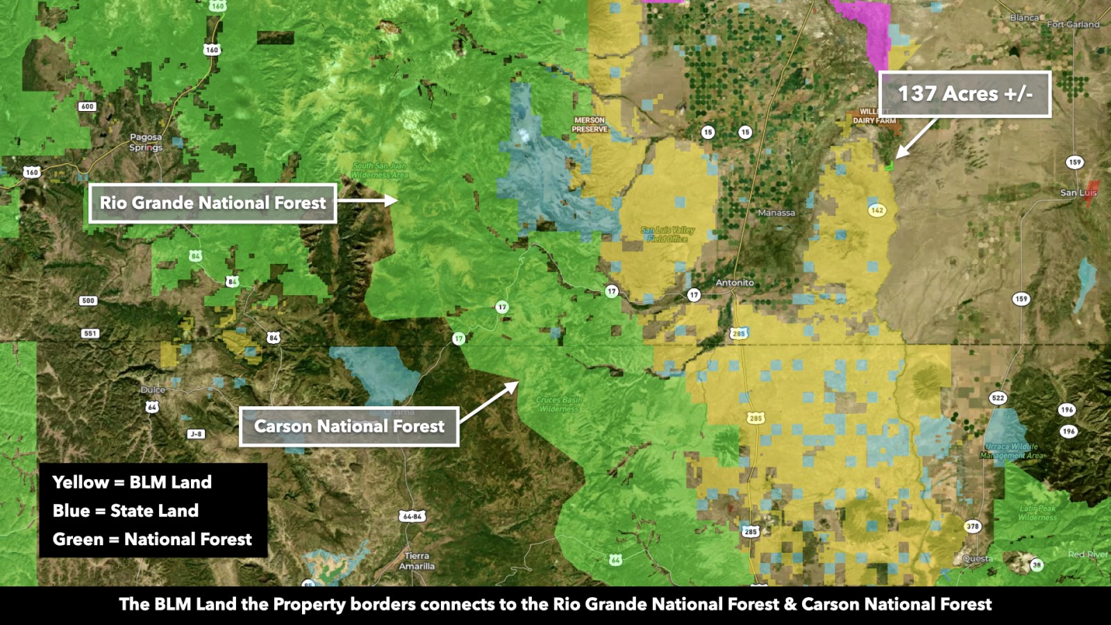 Over 1 Million Acres of contiguous Public Land border the Property along the West and South Boundaries. This includes over 60,000 Acres of BLM Land immediately South of the Property. The BLM Land extends South across the Colorado / New Mexico State Line and extends into the Carson National Forest and Rio Grande National Forest.