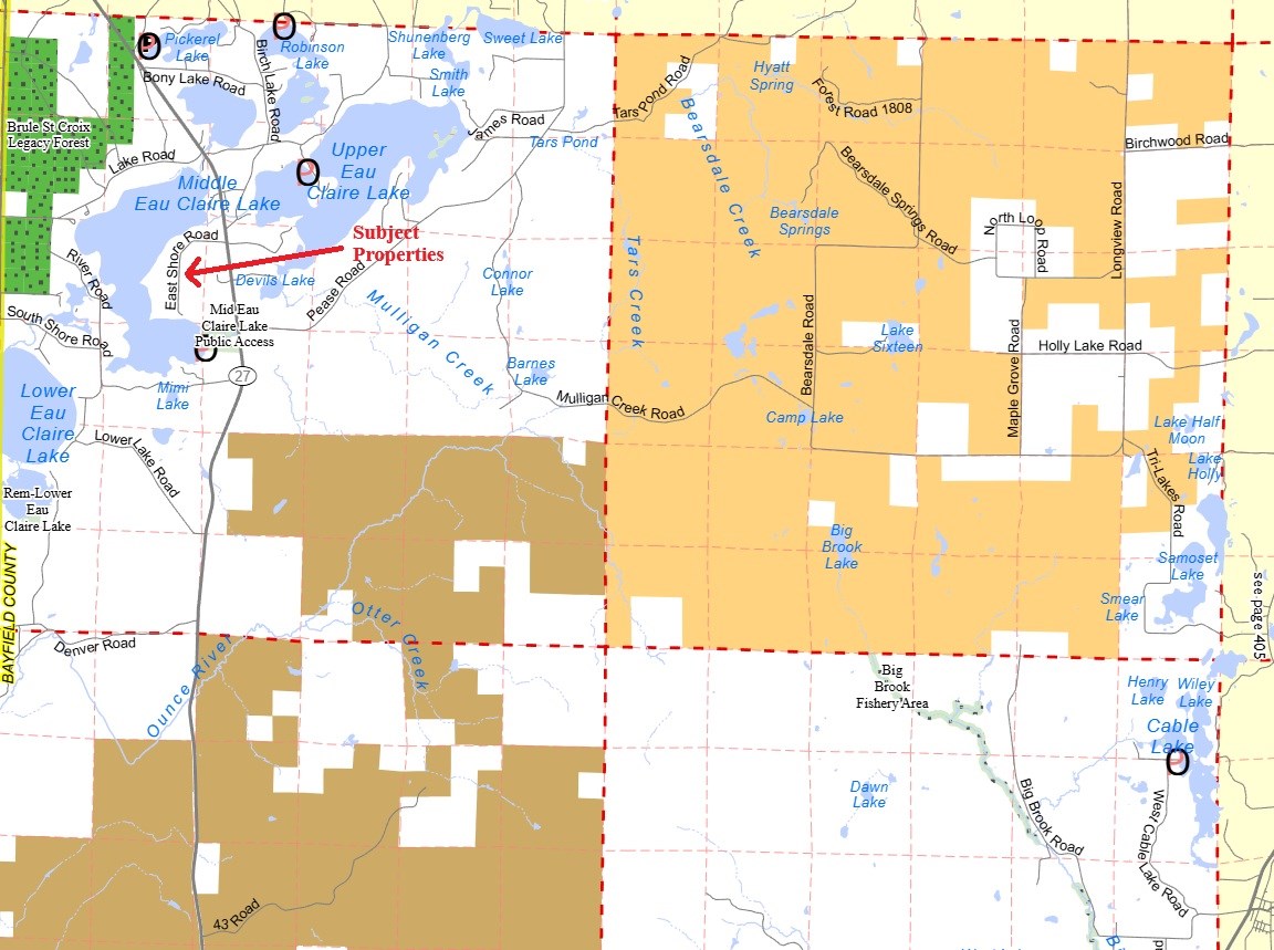 If you enjoy the water, 900-Acre, 66' deep Middle Eau Claire Lake and the Eau Claire Chain of Lakes are easily accessible and just short 5-minute drives from this stunning Barnes, WI acreage. These are all great lakes for boating, fishing and swimming. The branches and tributaries of the Eau Claire River, well known for canoeing and fishing, are also within a short distance from this prime acreage.