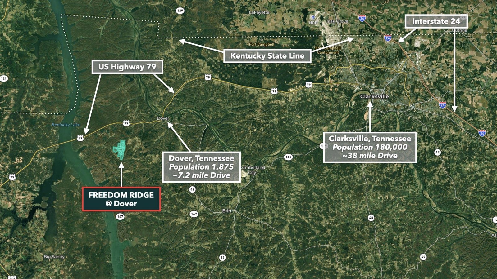 Freedom Ridge Dover is ideally situated between Kentucky Lake and Lake Barkley, while also being less than 3 miles from the South boundary of the 170,000 Acre Land Between the Lakes National Recreation Area.