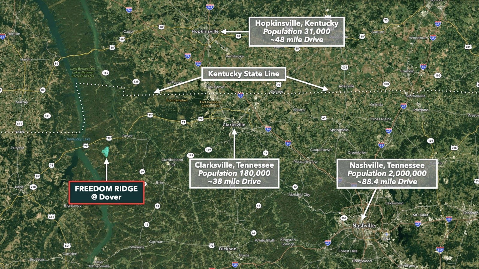 Nashville, the State Capital and Largest City in Tennessee, is 88 miles from Freedom Ridge Dover. Nashville and the surrounding metropolitan area have a population of more than 2,000,000.