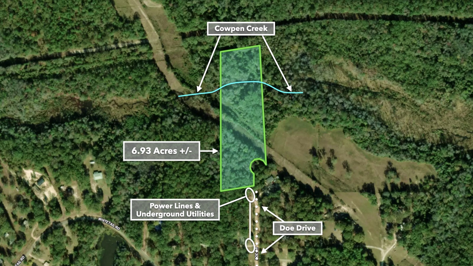 Doe Drive is a dirt road that ends in a quiet cul-de-sac at the southeast corner of the property, reinforcing the sense of seclusion while keeping you connected to nearby towns, recreation, and amenities.