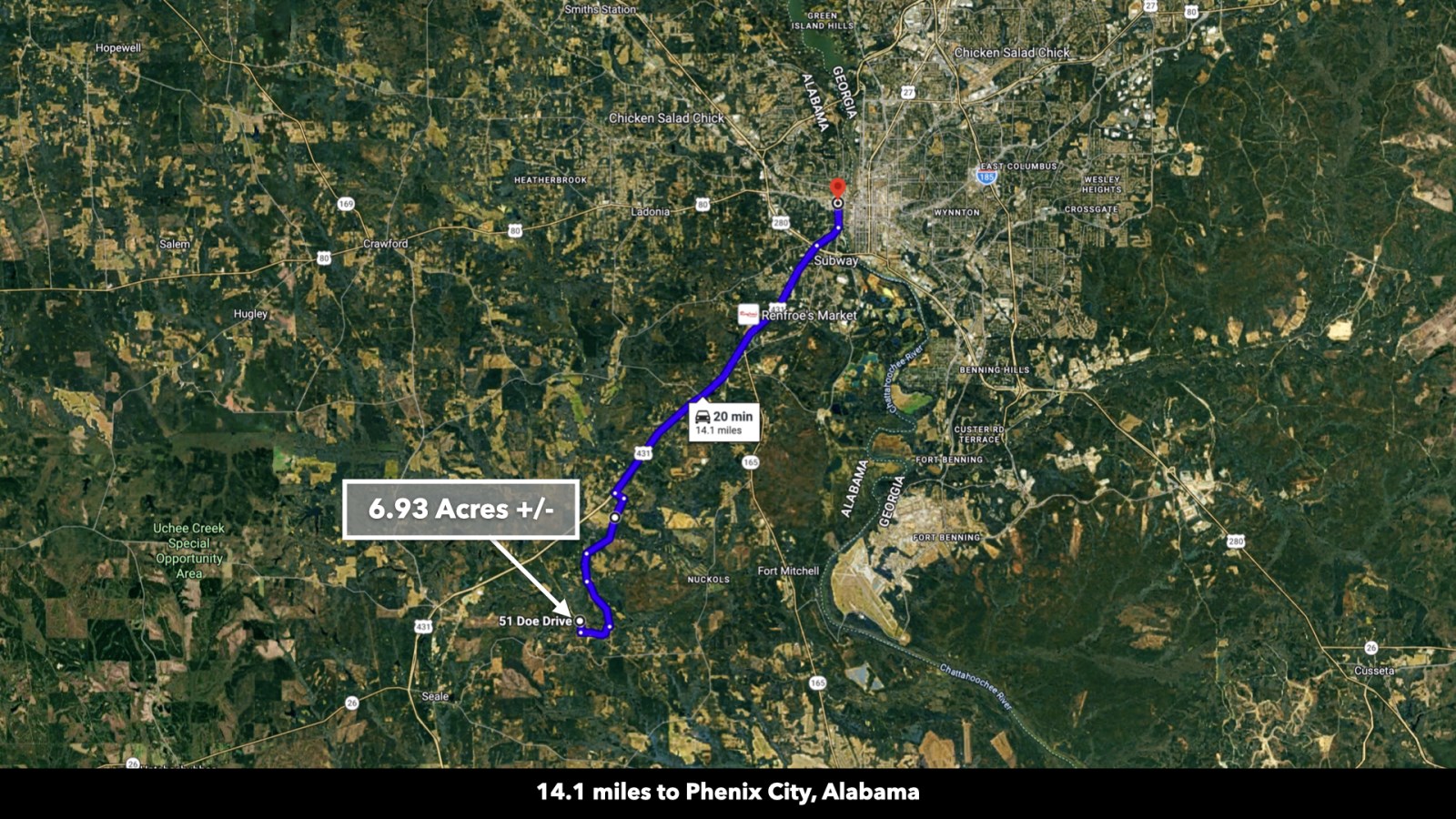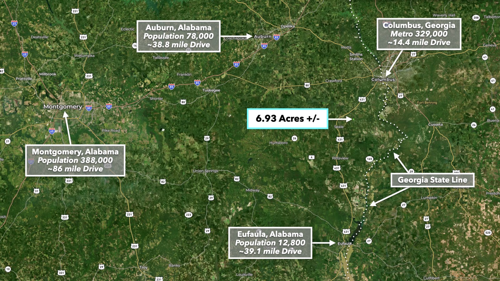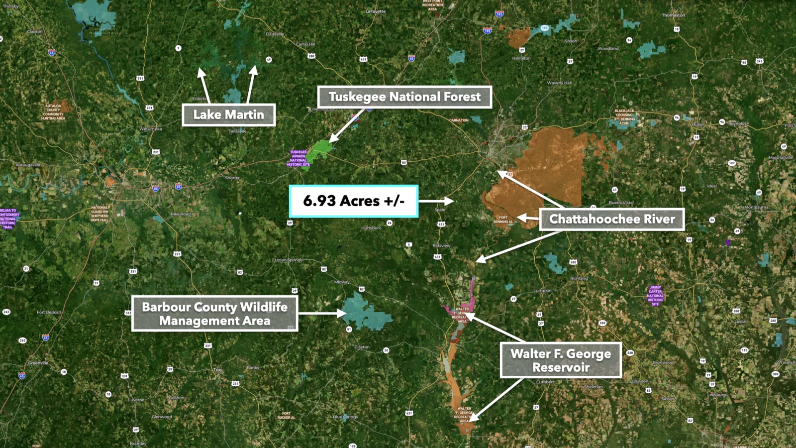 Well-positioned between rural Alabama and the riverfront culture of Columbus, Georgia, this 6.93 Acres property offers a strong sense of place. Over time, mature deciduous and evergreen trees, winding wildlife trails, and quiet wetlands have shaped the land into a secluded woodland retreat in eastern Russell County, Alabama.
