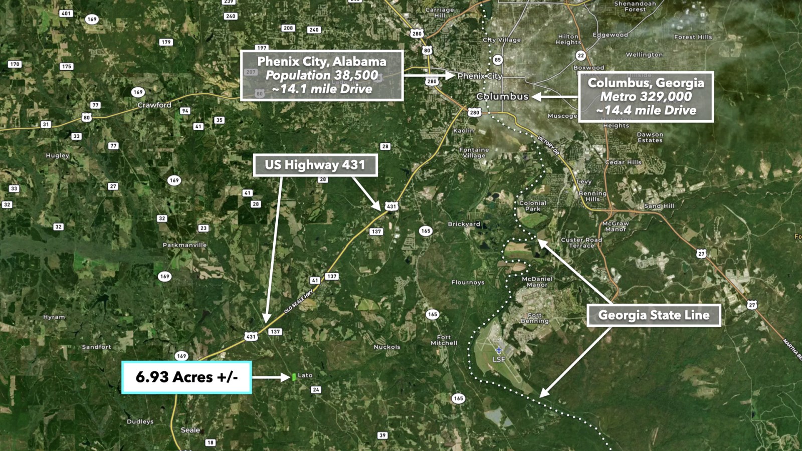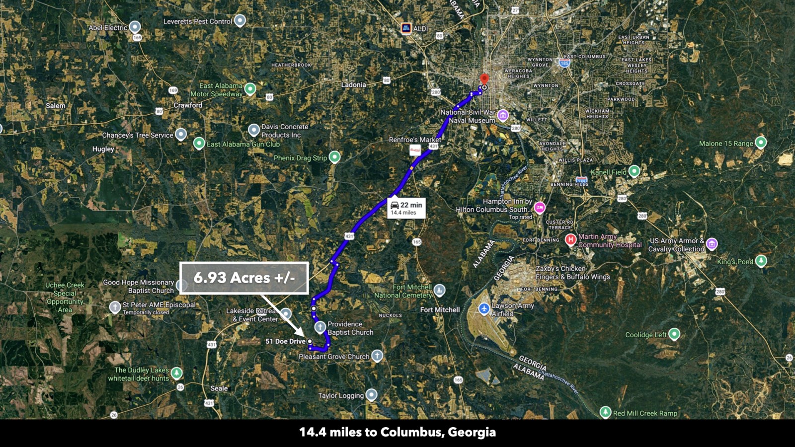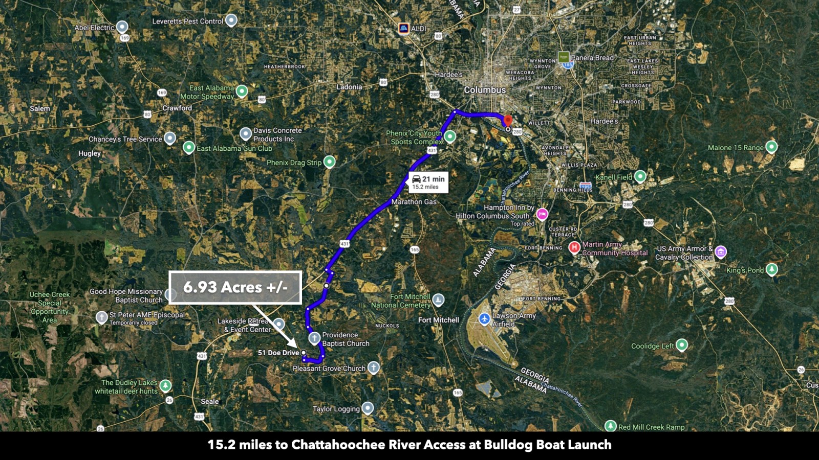 Well-positioned between rural Alabama and the riverfront culture of Columbus, Georgia, this 6.93 Acres property offers a strong sense of place. Over time, mature deciduous and evergreen trees, winding wildlife trails, and quiet wetlands have shaped the land into a secluded woodland retreat in eastern Russell County, Alabama.