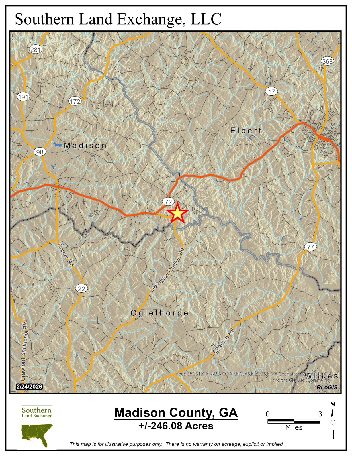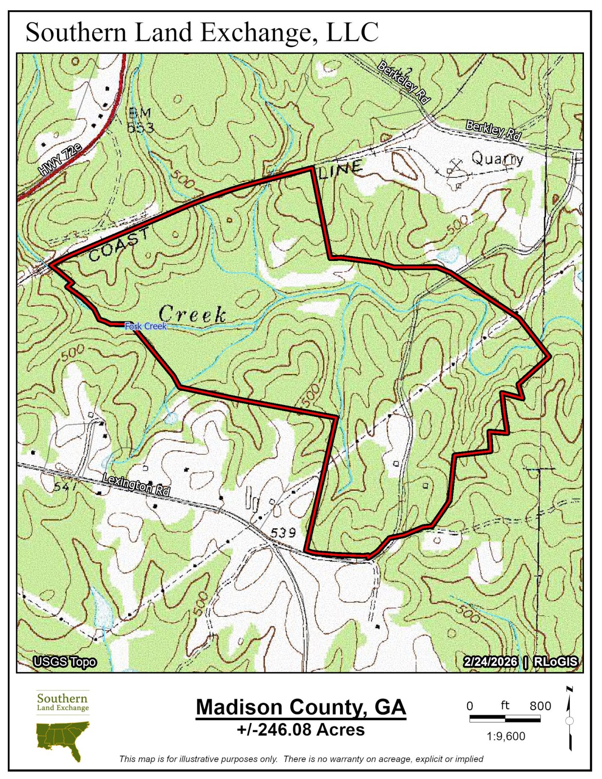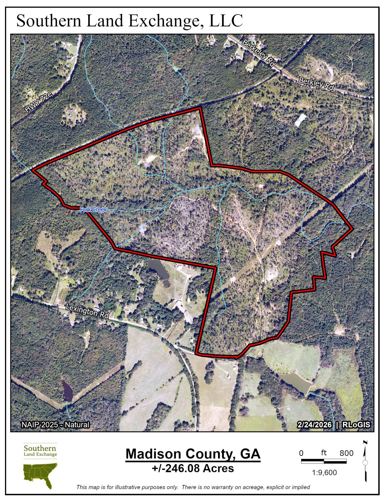 Southern Land Exchange is proud to present this large acreage tract in Madison County. This is one of very few if not the only land tract of 200+ acres on the market as of today. The property consists of +/- 246 acres and is made up of predominately mature hardwoods. The property was originally very thick and not extremely accessible. The owner removed most of the pines, leaving all the hardwoods which are present throughout the entire tract. This opened up the property and improved the overall aesthetics. Significant improvements were also made to the internal road system and creek crossings. Additionally, there is a new 40x60 pole barn on the property for equipment storage. The owner ran power to property entrance. This is a multifaceted property and would make an excellent recreational retreat. With over 5,000Ft of frontage on Fork Creek, the property is called Fork Creek Farm for a reason. Fork Creek is no small body of water. Over 20ft wide at parts and amazing shoals and waterfalls make it a must see and a very special part of this property. The property has 700 ft of frontage on Emma Cooper Road, as well as 3,000Ft of active CSX rail frontage. Other investment possibilities include potential industrial use and commercial poultry use. The property is currently zoned A1 for poultry, however with large adjoining industrial tracts, there is potential for a rezone to industrial as well. Reach out today for more information or to schedule your private showing.