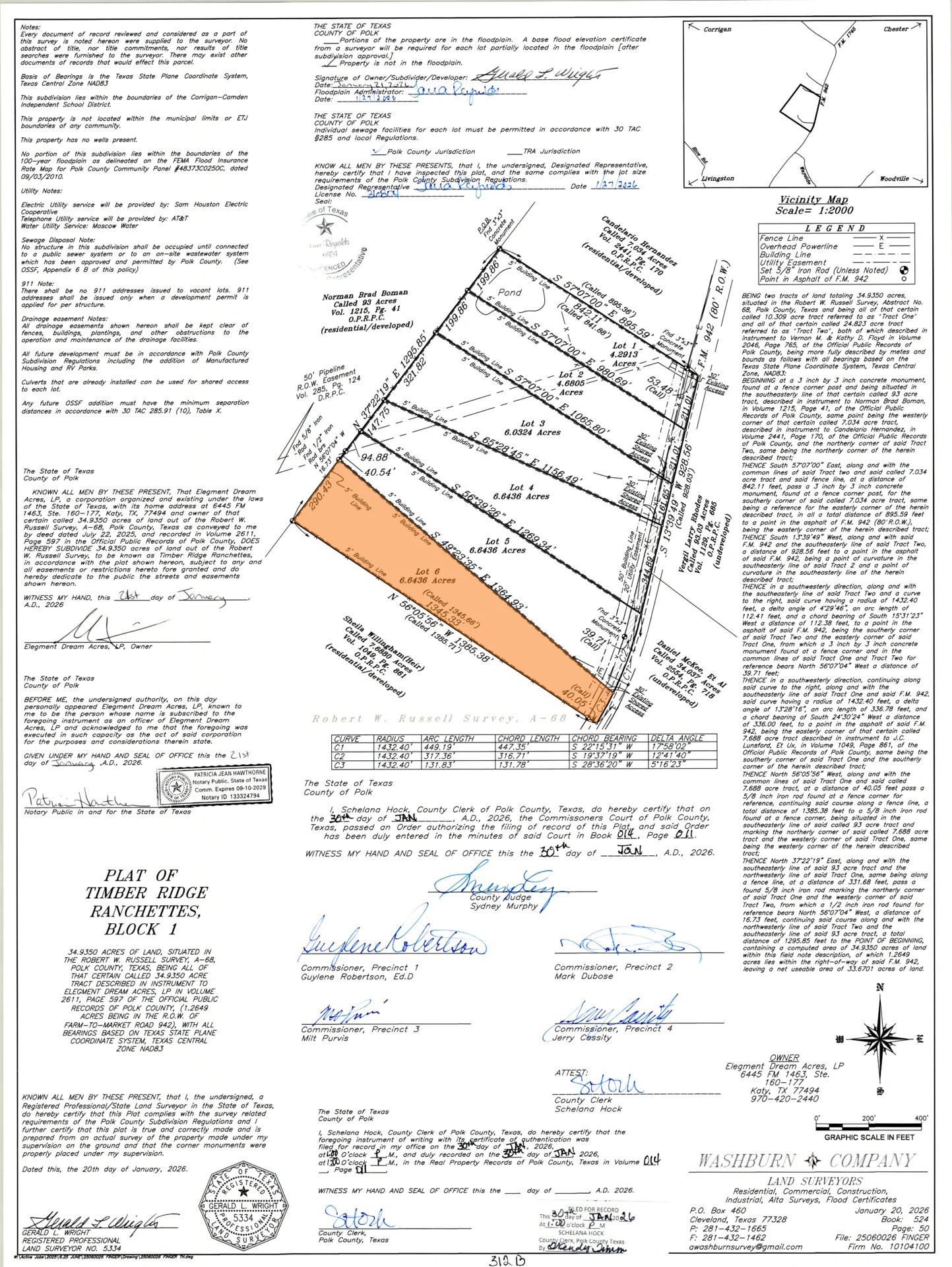 The overall subdivision was just approved in Commissioner's Court as of February 2026 and the Plat has been incorporated into the County's official records.