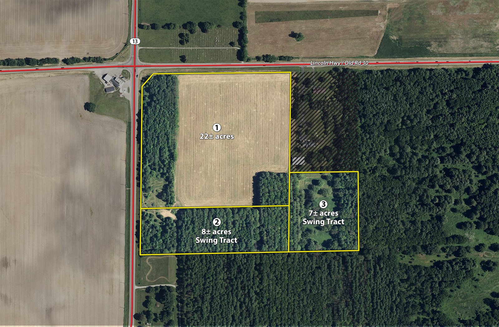 Tract 1: 22± ac Cropland And Wooded Acres with large amount of road frontage on both Old U.S. 30 and State Rd 13. This tract also offers a beautiful building site along with productive farm acres. Soils are predominantly Riddles fine sandy loam.
