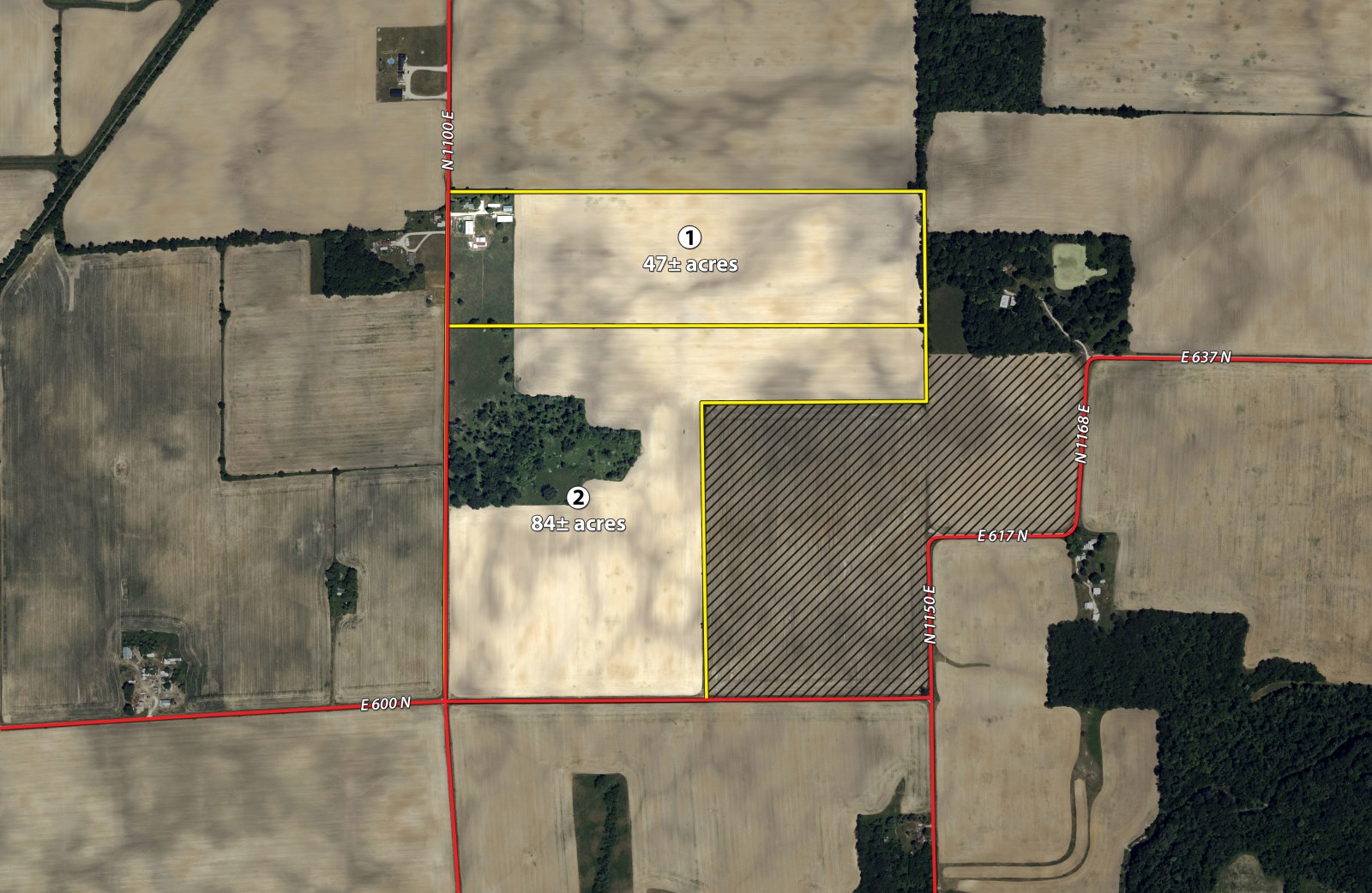 Tract 1: 47± ac Single Family Home, 1,700 sq ft, 3 bedroom, 1 bath, and cattle & storage barns. Frontage on N 1100 E, 40+/- tillable acres. Predominate soils are Pewamo Silty Clay loam and Blount Silt loam.